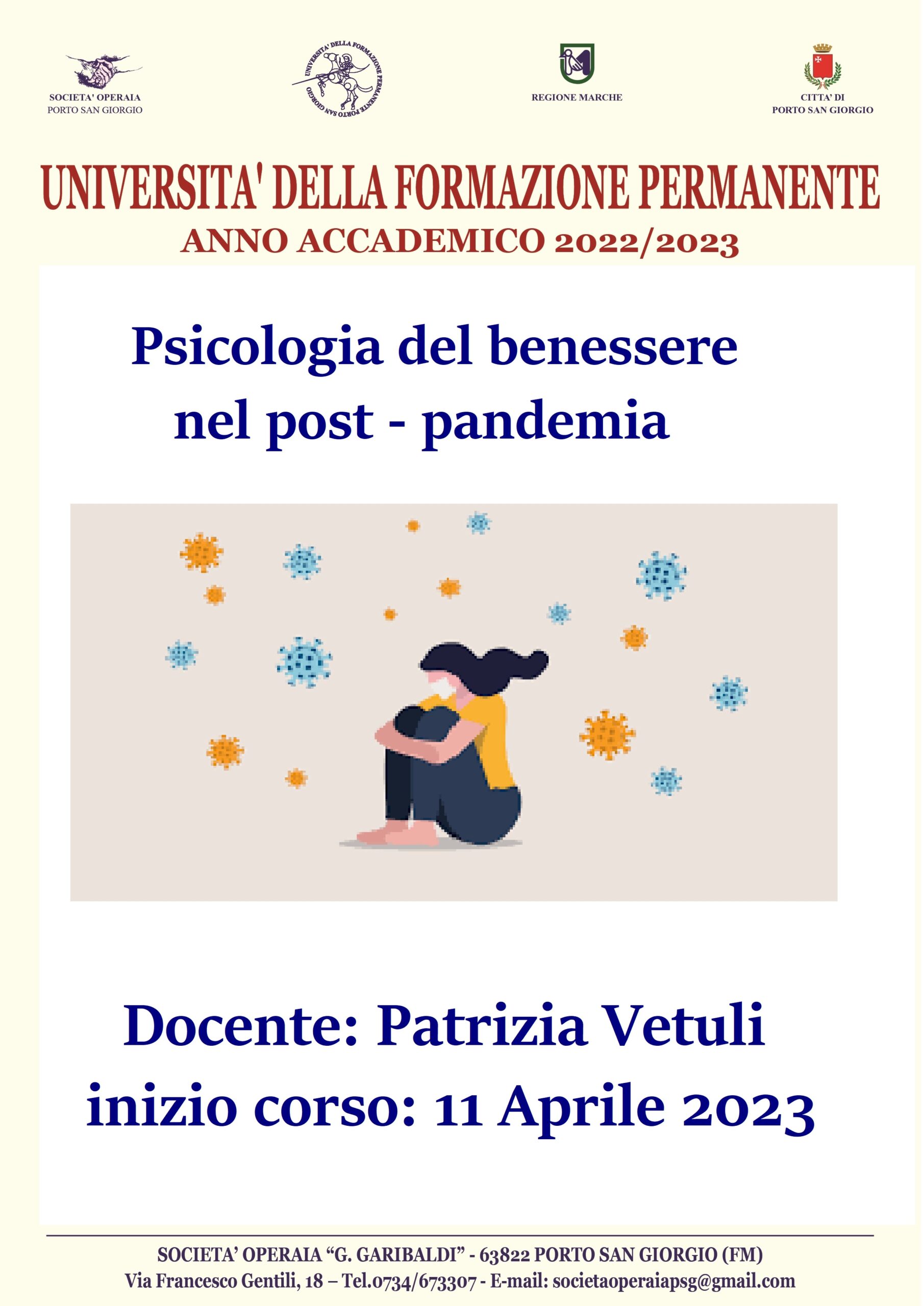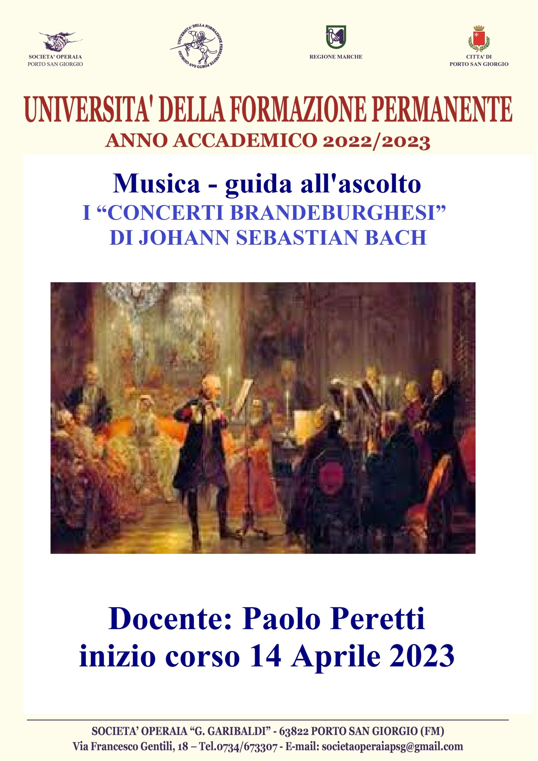L'università della formazione permanente organizza due corsi che si terranno alla Società Operaia "G. Garibaldi" di Porto San Giorgio nel mese di aprile. Il corso "Psicologia e benessere nel post-pandemia" inizierà l'11 aprile e sarà tenuto dalla docente Patrizia Vetuli mentre il corso "Musica-guida all'ascolto, i concerti brandeburghesi di Johan Sebastian Bach" sarà tenuto dal docente Paolo Peretti ed avrà inizio il 14 aprile.