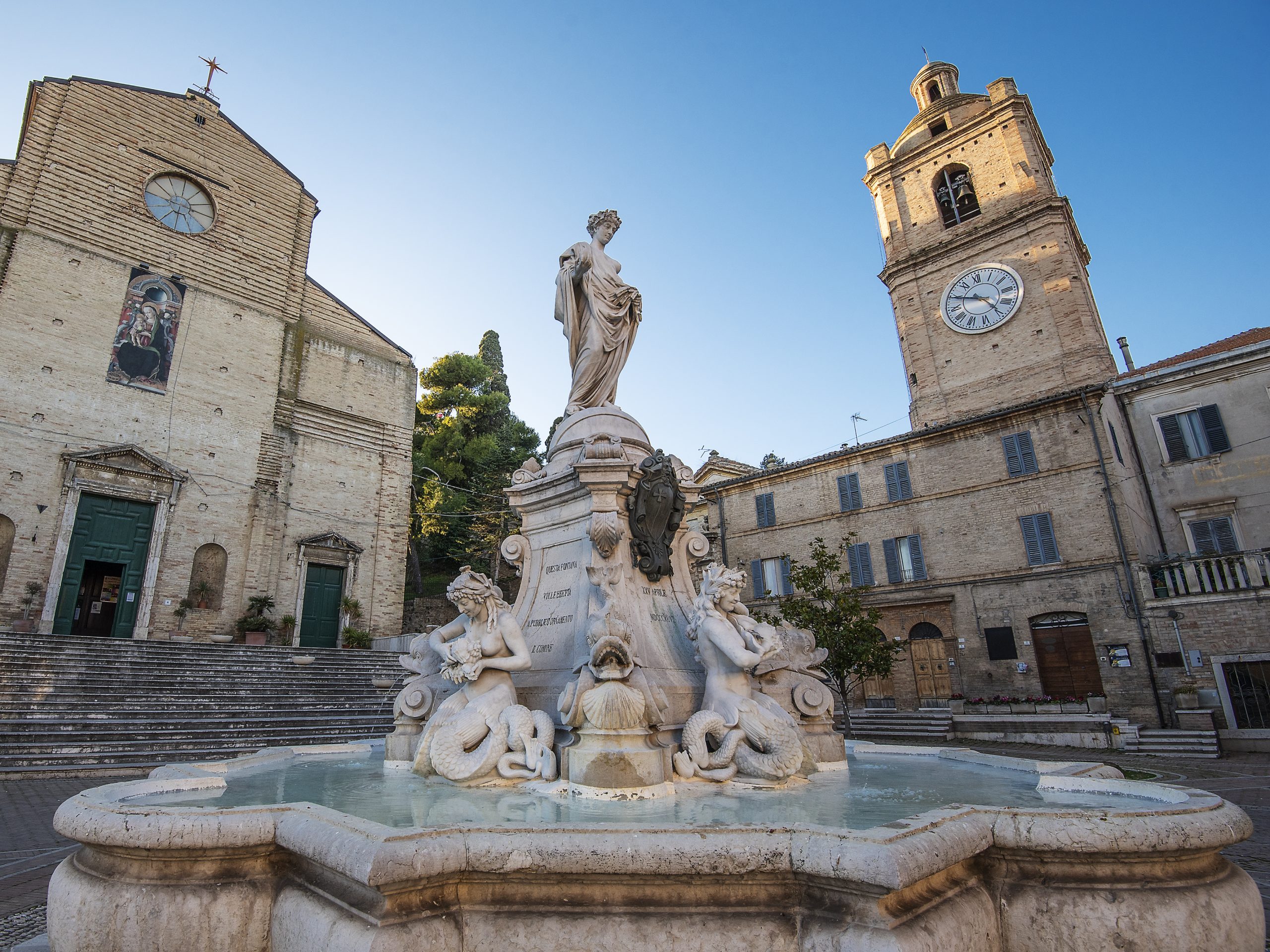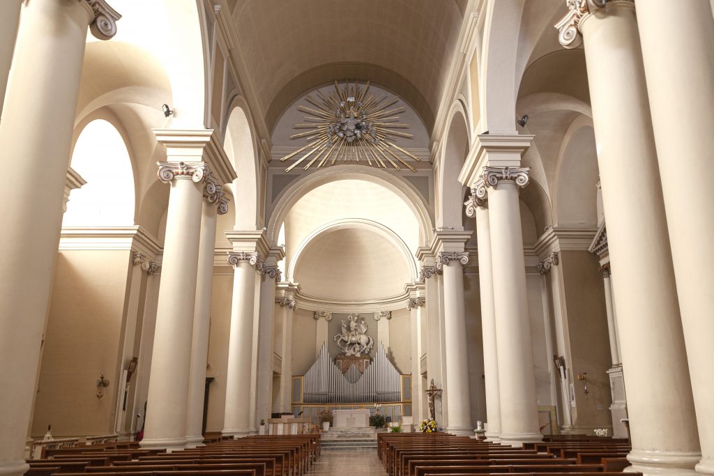 Parish Church dedicated to San Giorgio, patron saint of the city. The church was built between 1831 and 1851 on the architect Giunchini’s project, in neoclassical style, divided in three naves by twin ionic columns. Inside there are a monumental statue of the Saint on horseback, by Giovanni Paci (1840), a canvas with the Saints of the Franciscan Order by the painter Gaetano Gandolfi, from Bologna, and also a copy of the famous Polittico by Carlo Crivelli.
