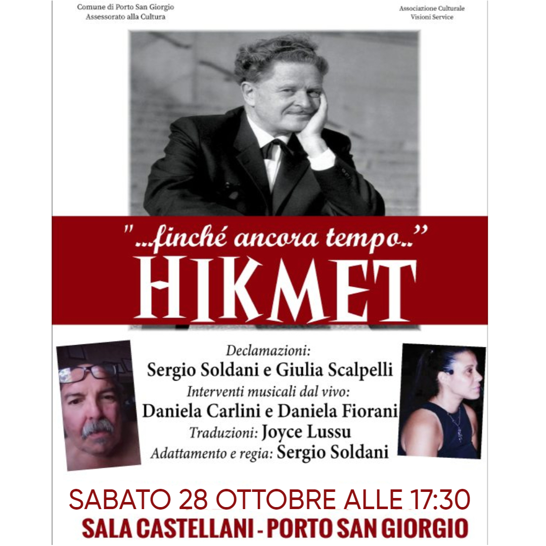 Sabato 28 ottobre nella sala Castellani (ore 17,30, ingresso gratuito) le poesie del poeta turco Nazim Hikmet saranno declamate nell’incontro dal titolo “Finché ancora tempo” dal regista Sergio Soldani e da Giulia Scalpelli. Sono in programma interventi musicali dal vivo con Daniela Carlini (violino) e Daniela Fiorani (tastiere). “La replica, vicina all’evento della scorsa estate, è dovuta all’entusiasmo che Hikmet suscita in considerazione del fatto che la traduttrice e potessa Joyce Lussu risiedette a Fermo”, spiega Soldani. L’iniziativa è dell’Assessorato alla Cultura e dell’associazione Visioni service.