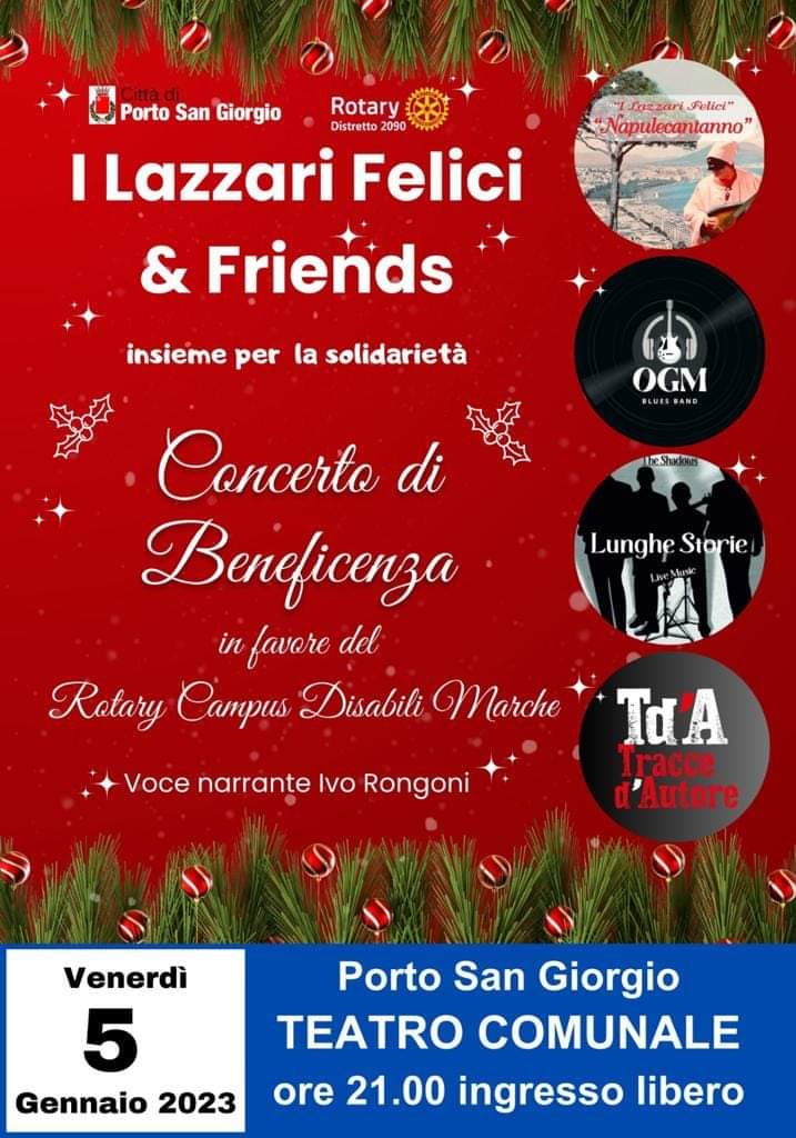 NAPULECANTANNO- tributo alla musica napoletana di ieri e di oggi con I Lazzari Felici. Concerto di beneficienza. Ingresso libero. Il 5 gennaio 2024 alle 21 presso il teatro comunale.