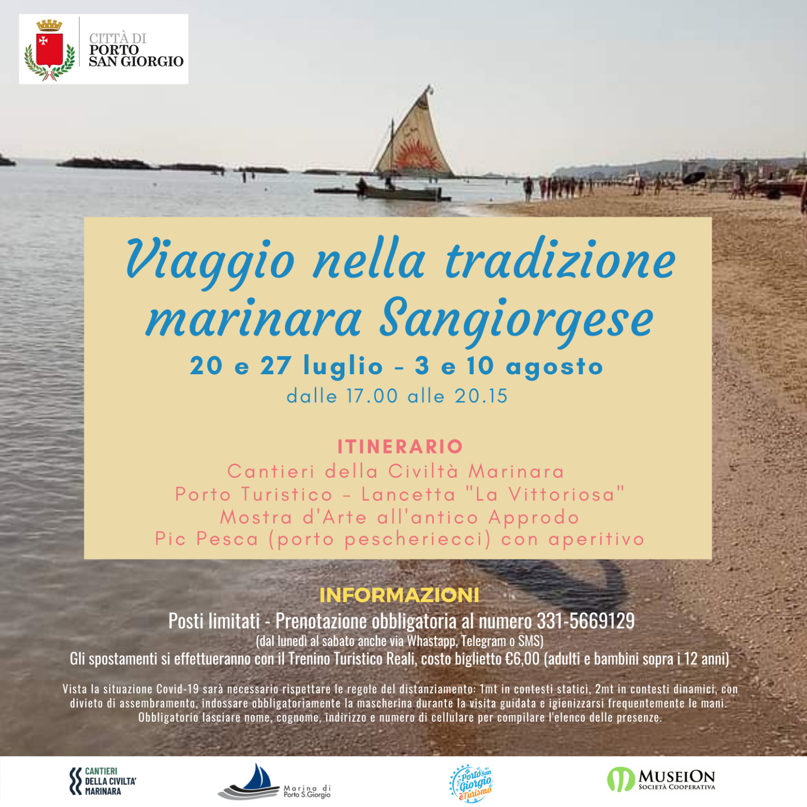 Viaggio nella tradizione marinara Sangiorgese, in collaborazione con la  Soc. Coop. MuseiOn, ritrovo davanti al Teatro Comunale ore 17.00, termine visita ore 20.15, ore 17.10 visita ai Cantieri della Civiltà Marinara, ore 18.10 partenza col Trenino per visita al porto turistico, alla lancetta la vittoriosa e Mostra d’arte Approdo, segue degustazione, info e prenotazioni obbligatorie: 3315669129 (lun-sab 10.00-13.00). La visita verrà effettuata tramite il trenino di Francesco Reali al costo di € 6,00 (per adulti e per bambini sopra i 12 anni).