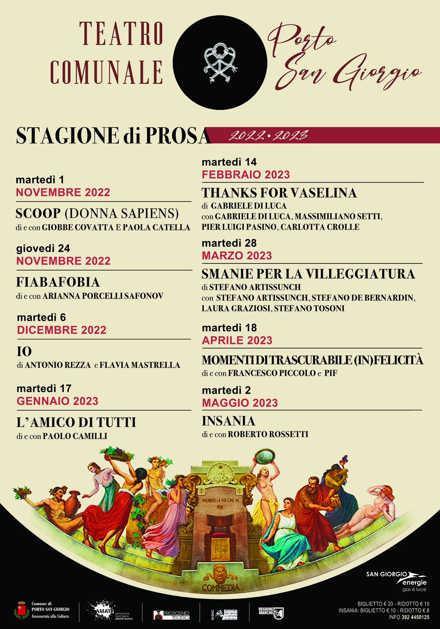 Stefano Tosoni (direttore artistico) prima di passare alla presentazione della Prosa e dei quattro appuntamenti di “Sottopassaggi”, ha poi spiegato che “il programma si è orientato sul sorriso dopo aver vissuto tutti noi un periodo cupo, offrendo alternative in zona. Si parte con Giobbe Covatta il 1 novembre con “Scoop”, un comico di sostanza, poi spazio il 24 a “Fiabafobia” di Arianna Porcelli, grandi scrittrice e super seguita sui social”.