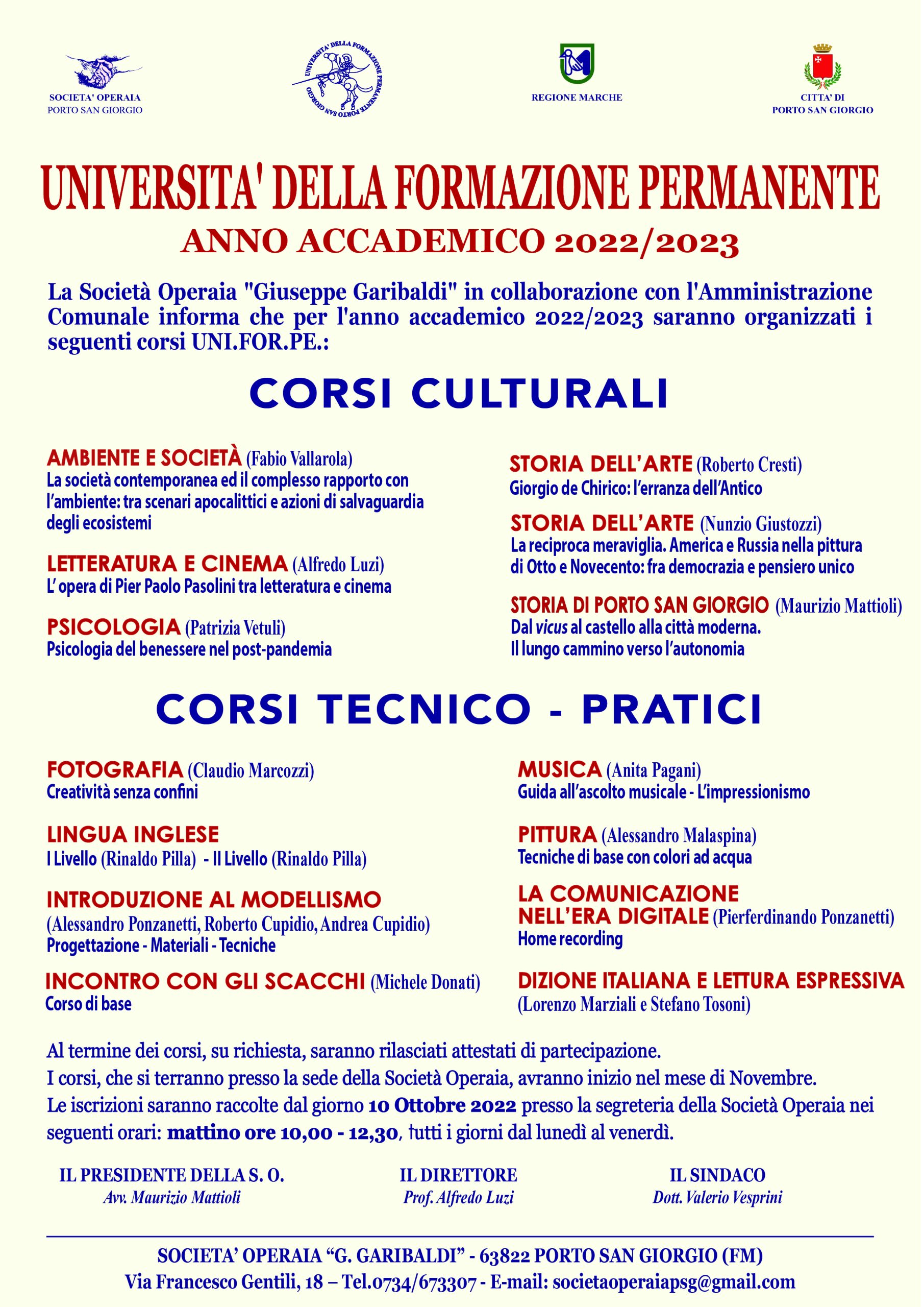 La Società Operaia "Giuseppe Garibaldi" in collaborazione con l'Amministrazione Comunale informa che anche quest'anno si svolgeranno i corsi UNI.FOR.PE