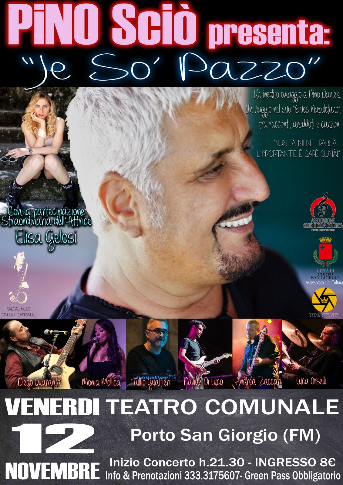 Venerdì 12 novembre, Teatro Comunale. Pino Sciò presenta: "Je So' Pazzo", un inedito omaggio a Pino Daniele, un viaggio nel suo "Blues Napoletano" tra racconti, aneddoti e canzoni, con i musicisti Diego Quaranta, Monia Mollica, Tullio Gualtieri, Davide Di Luca, Andrea Zaccari e Luca Orselli. Con la partecipazione straordinaria dell'attrice Elisa Gelosi. Special guest Vincent Campanelli.