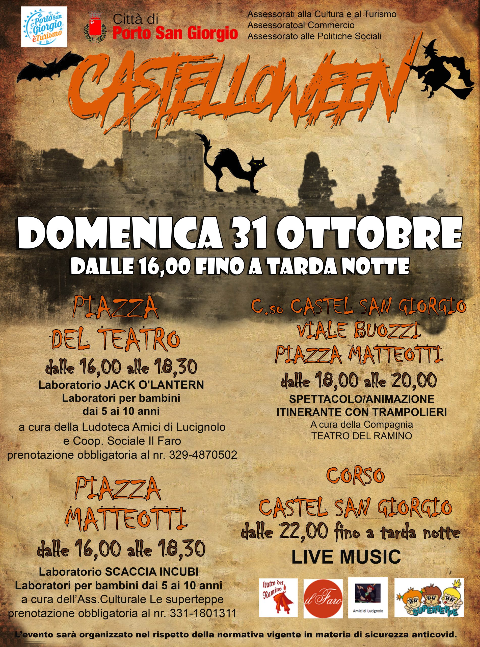 Castelloween. Domenica 31 ottobre dalle ore 16 fino a tarda notte: laboratori per bambini a P.zza del teatro e Piazza Matteotti e spettacolo itinerante con trampolieri da Corso Castel San Giorgio, lungo Viale Buozzi, fino a Piazza Matteotti.
