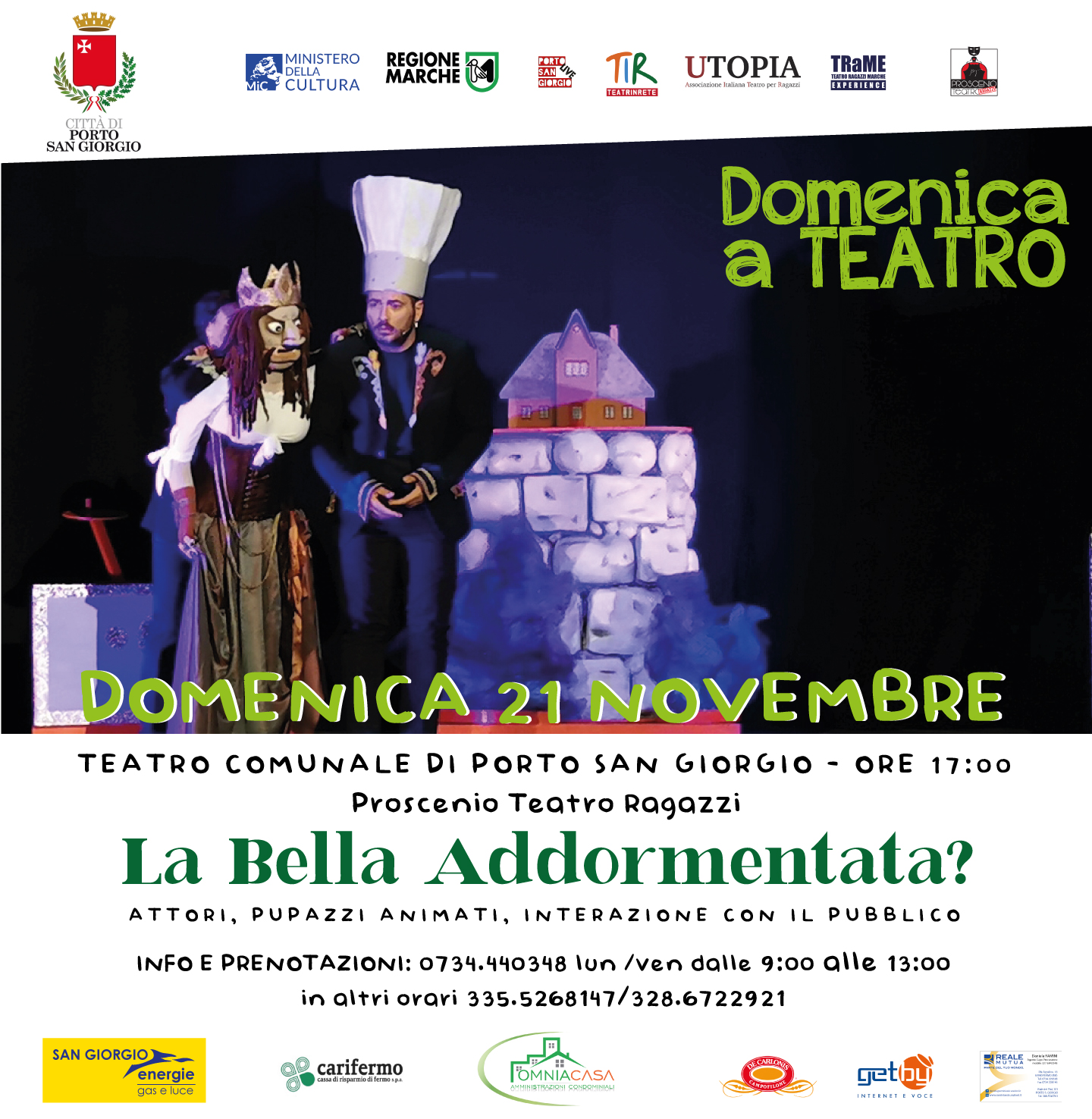 Domenica 21 Novembre, ore 17:00, al Teatro Comunale di Porto San Giorgio riparte la XXV edizione di Teatro per Ragazzi e Famiglie “DOMENICA A TEATRO”, organizzata da Proscenio Teatro Ragazzi.