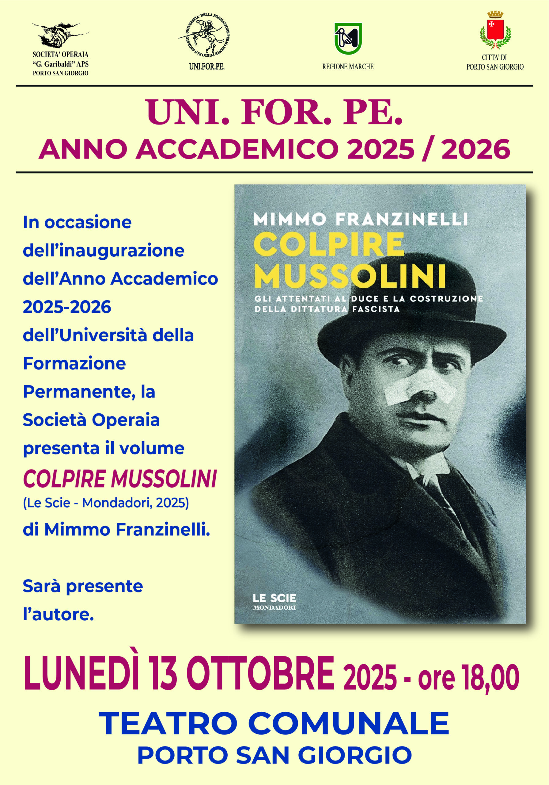 In occasione dell’inaugurazione dell’Anno Accademico 2025-2026 dell’Università della Formazione Permanente, la Società Operaia presenta – al TEATRO COMUNALE di PORTO SAN GIORGIO – il volume COLPIRE MUSSOLINI (Le Scie – Mondadori, 2025) di Mimmo Franzinelli.