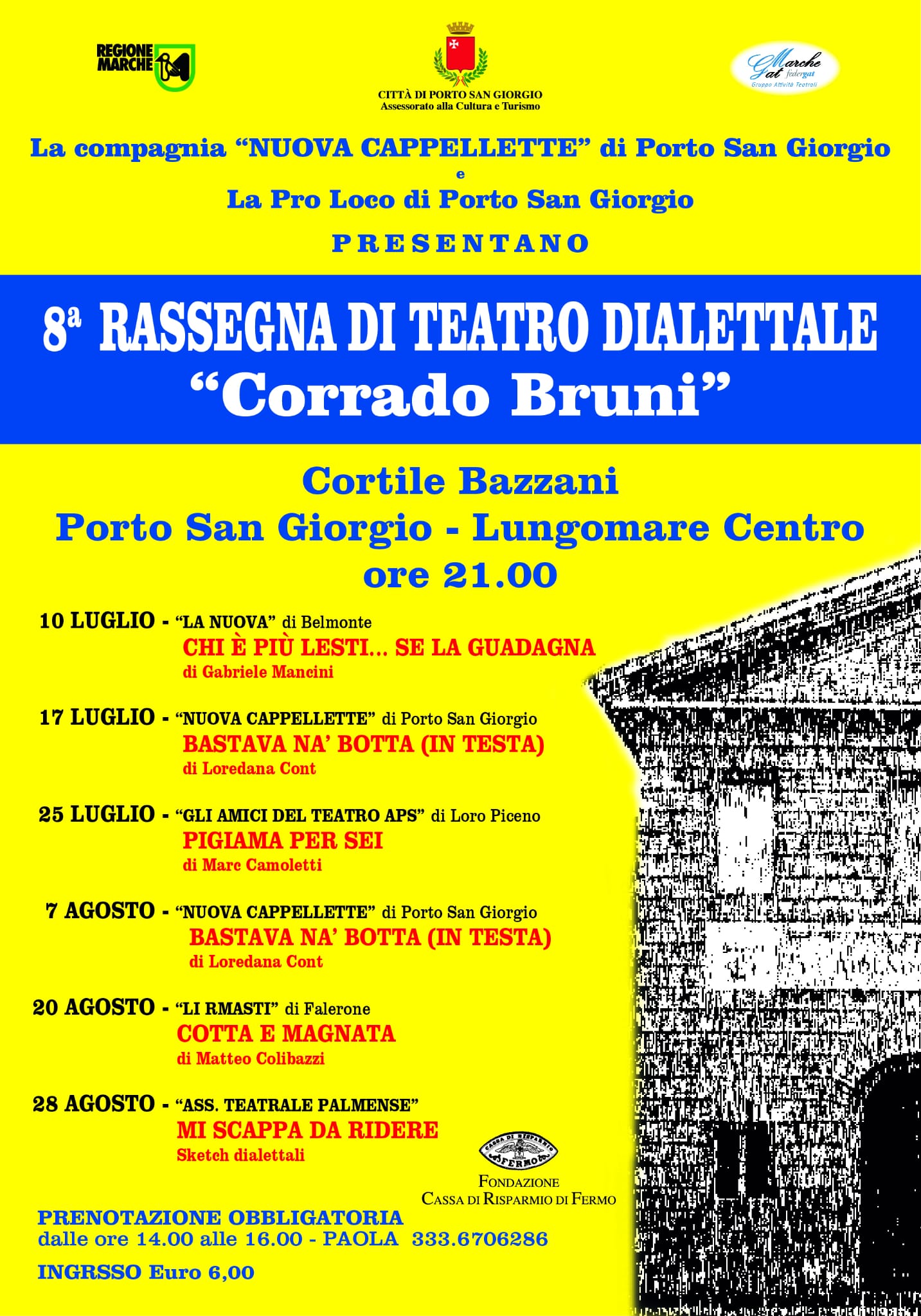 Cortile Bazzani, ore 21.30, VIII Rassegna dialettale amatoriale “Corrado Bruni”, a cura dell’Associazione Nuova Cappellette con la Pro Loco Porto San Giorgio, Bastava na botta (in testa) di Loredana Cont, compagnia Nuova Cappellette, per info e prenotazioni 3336706286.