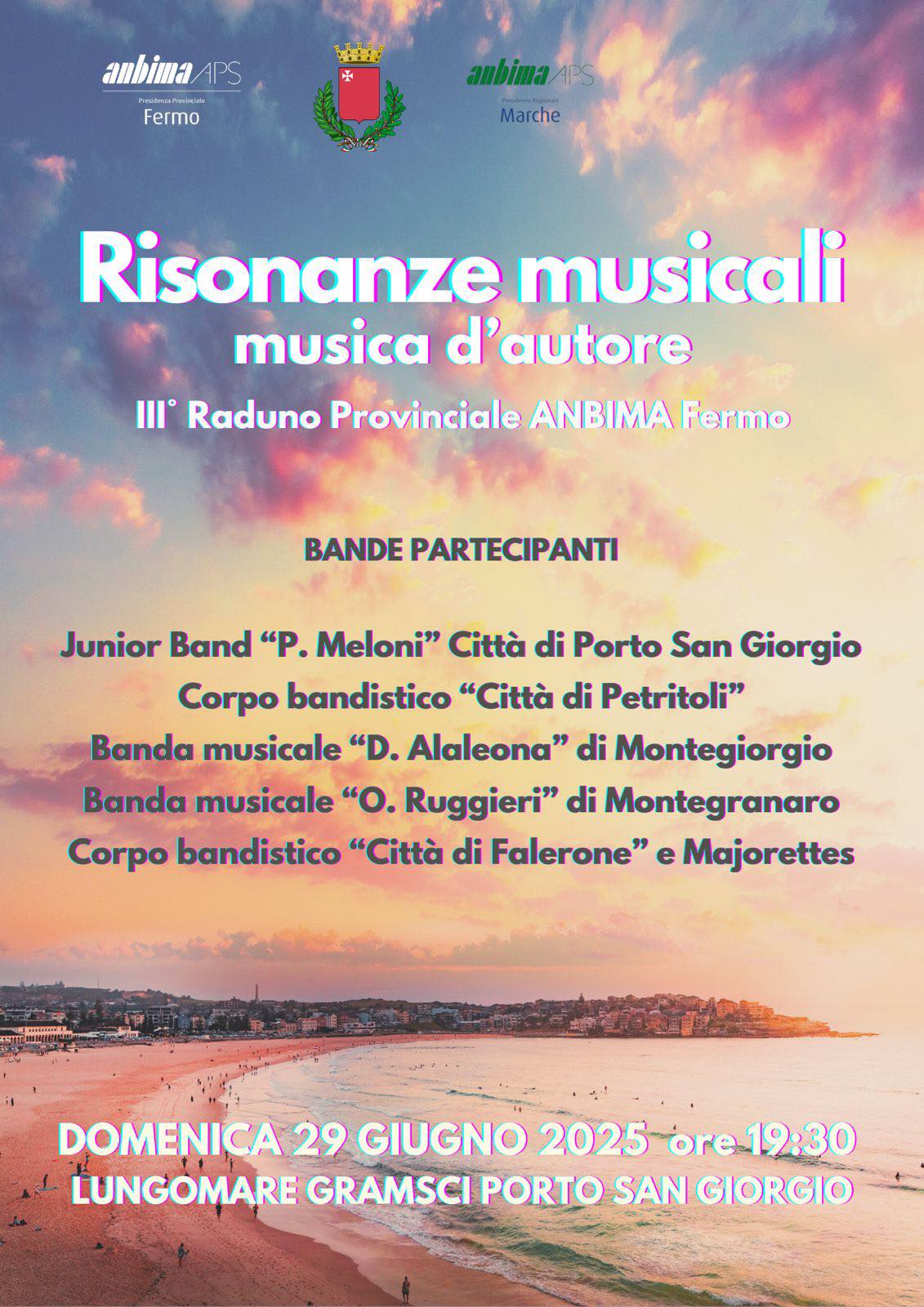πΆπΌDomenica 29 giugno alle 19:30 presso il lungomare Gramsci – RISONANZE MUSICALI, musica d’autore- III raduno provinciale ANBIMA Fermo