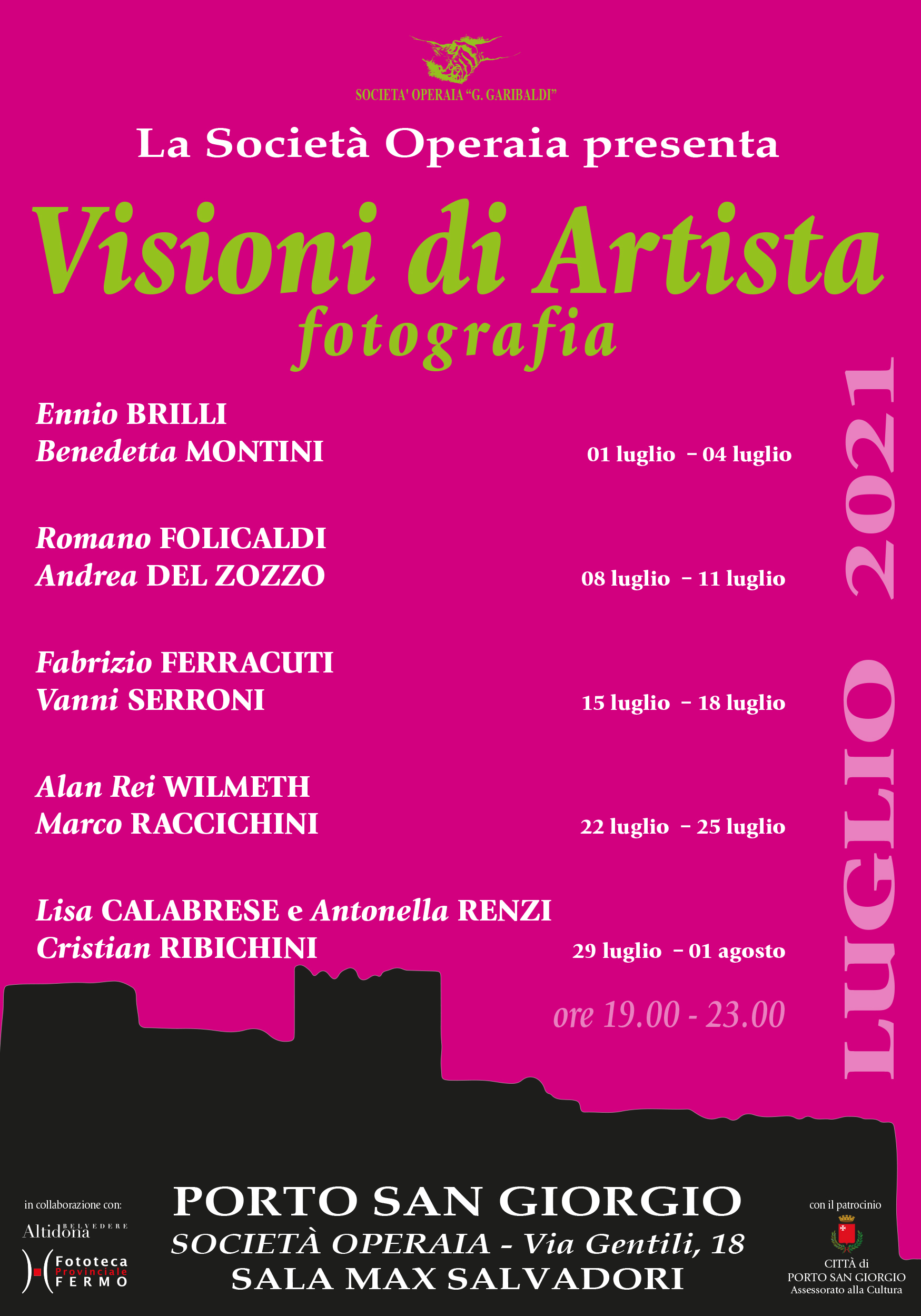 La Società Operaia, in collaborazione con la Fototeca Provinciale – Altidona Belvedere e con il patrocinio del Comune di Porto San Giorgio, ha organizzato la seconda edizione della Rassegna “VISIONI DI ARTISTA”, quest’anno dedicata alla fotografia.