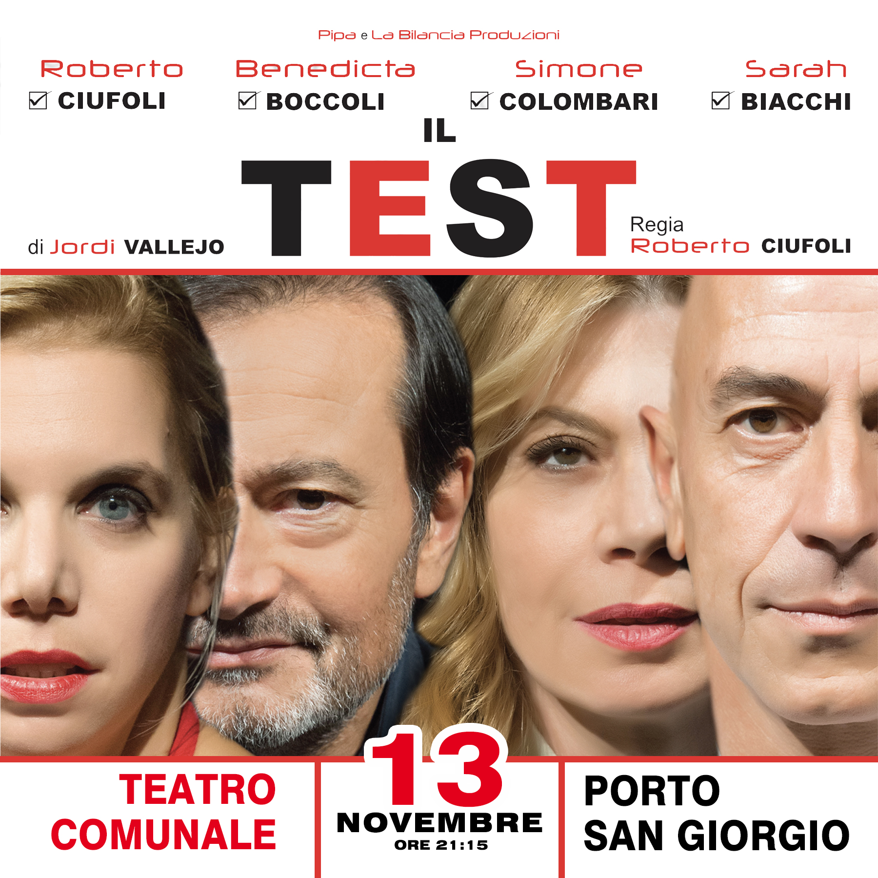 Sabato 13 novembre - ROBERTO CIUFOLI, BENEDICTA BOCCOLI, SIMONE COLOMBARI e SARAH BIACCHI in IL TEST - Pipa e La Bilancia Produzioni