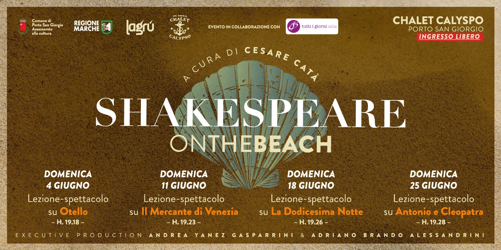 Nelle 4 domeniche di giugno tornano, presso lo chalet Calypso, le lezioni spettacolo a cura di Cesate Catà I 4 appuntamenti saranno: Otello (4 giugno, ore 19:18), Il mercante di Venezia (11 giugno, ore 19:23), La dodicesima notte (18 giugno, ore 19:26), Antonio e Cleopatra (25 giugno, ore 19:28) Appuntamenti da non perdere!